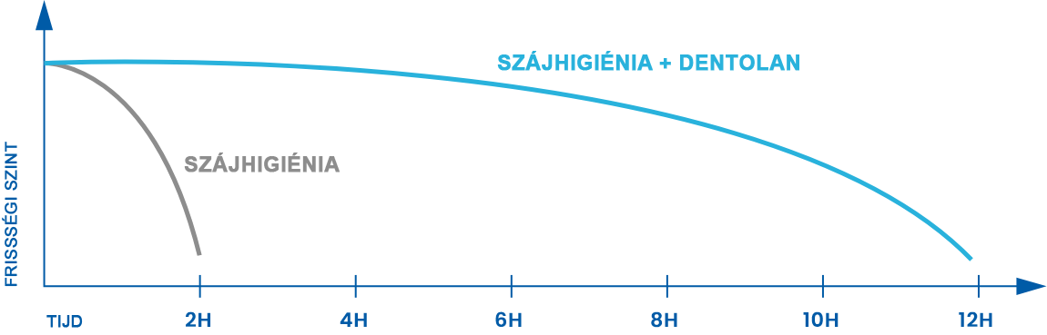Ahogy a grafikon mutatja, a Dentolan szájhigiéniával kombinálva sokkal hosszabb frissességet garantál, mint a szájhigiéna önmagában.
